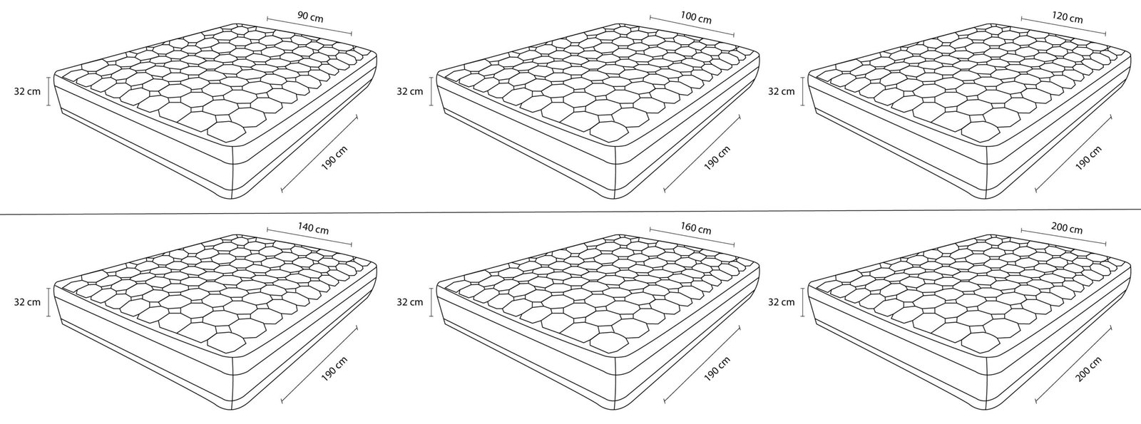 90×190, 100×190, 120×190, 140×190, 160×190, 200X200